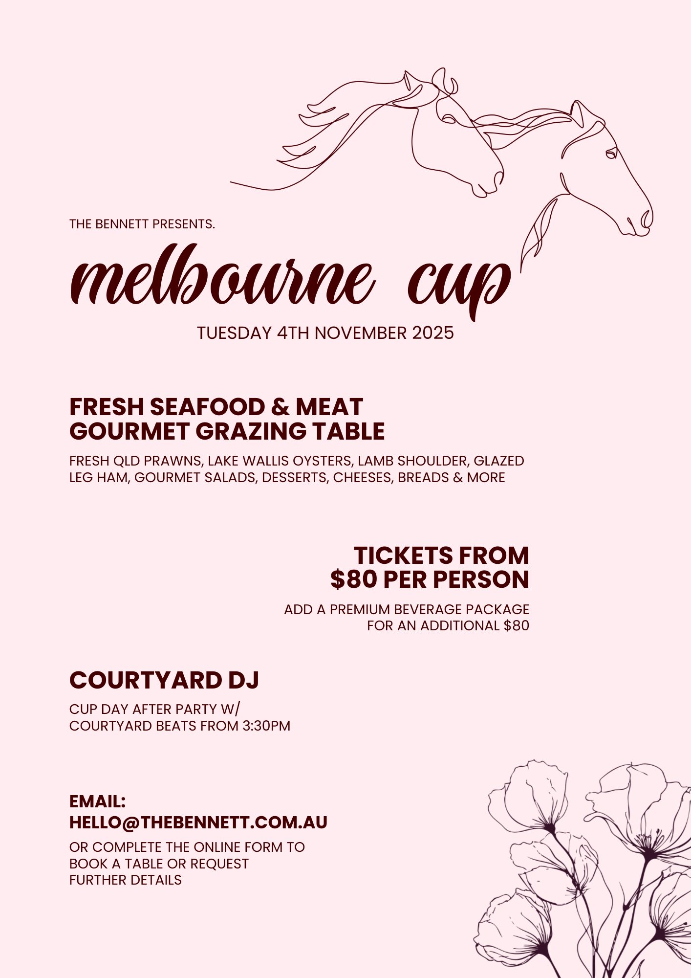 Cup Day is fast approaching and we’re excited to offer you an amazing day to enjoy with friends & colleagues! Our chefs will be platting an exception gourmet grazing table with fresh seafood & array of meats. With multiple screens & betting facilities throughout, you’ll be sure to have a wonderful Cup Day at The Bennett.
